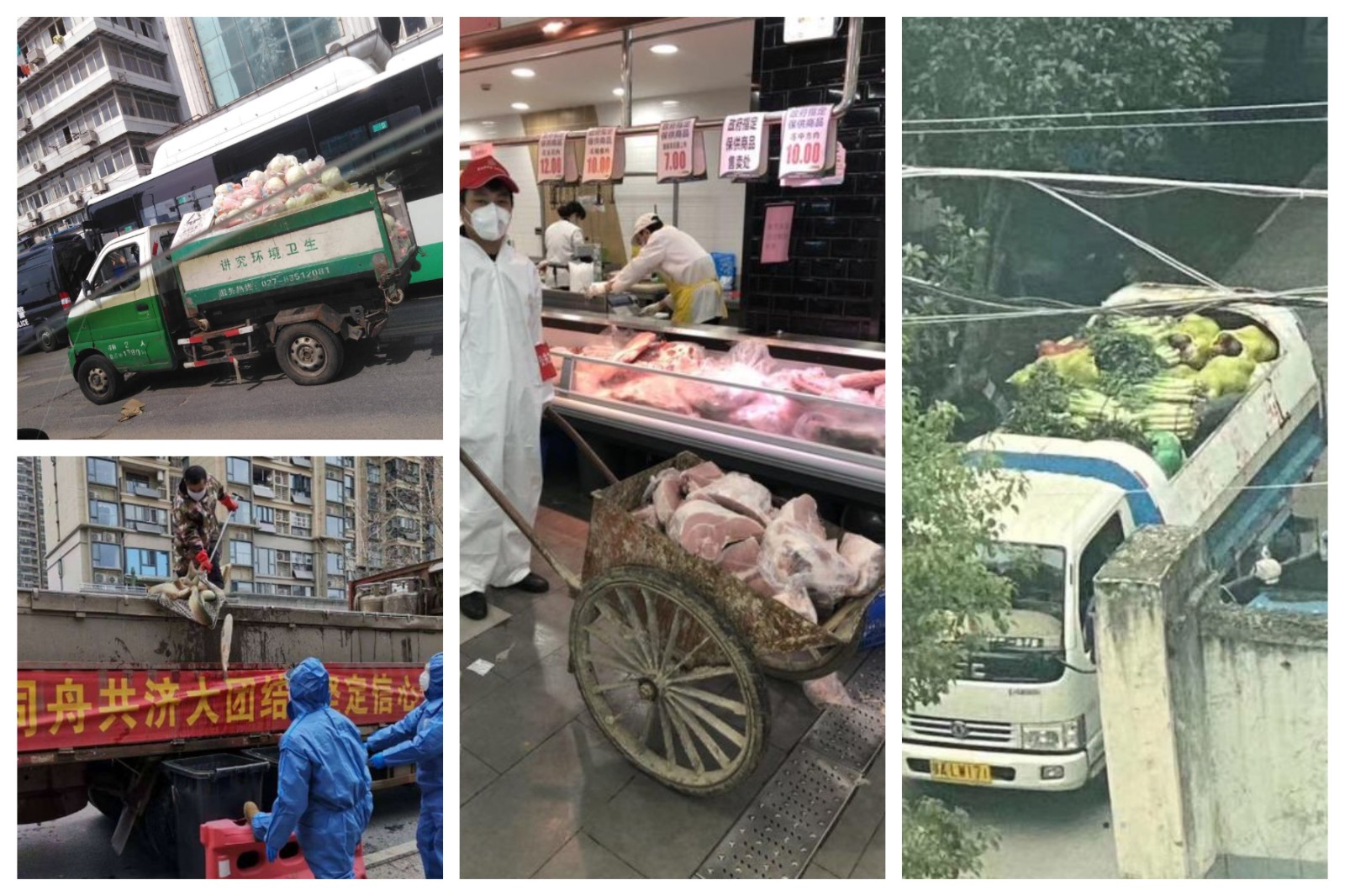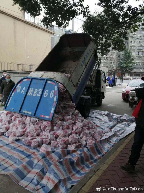 ▲武汉社区被曝出用垃圾车运送蔬菜等物资。(图片源于网络)