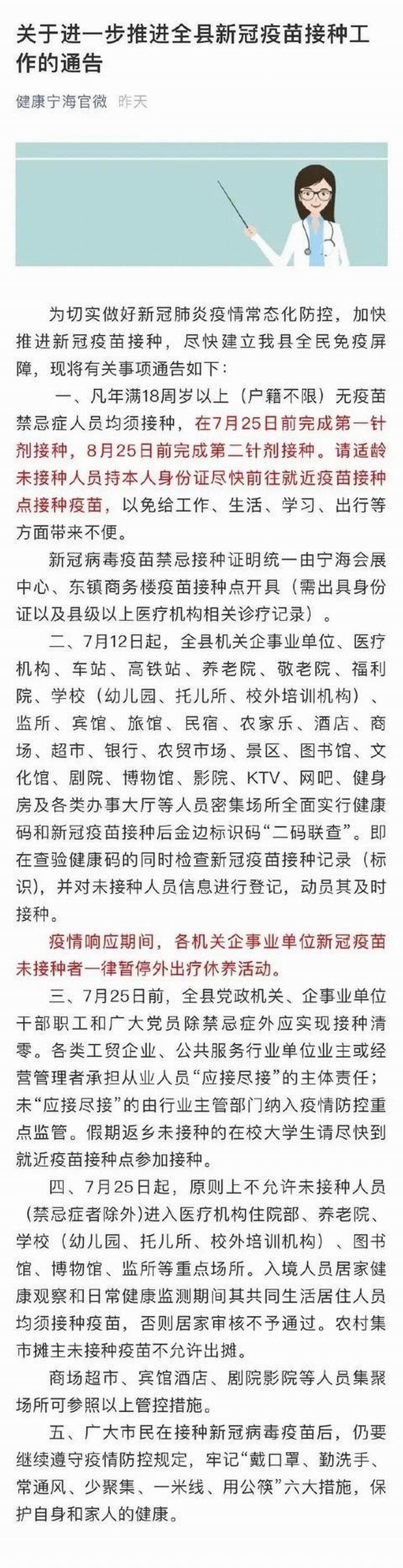 ▲7月11日发布的《关于进一步推进全县新冠疫苗接种工作的通告》已删除了这条通告。(图片来源于微信公众号“健康宁海官微”截图)