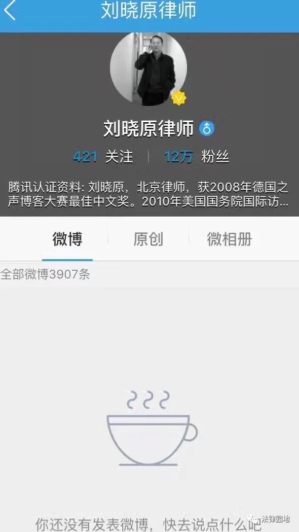 截止2015年6月5日,被关闭的“刘晓原律师”微博,已发微博帖子21850条,关注博友3007人,粉丝127031人。