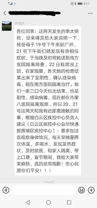 25日,网上传出一份广州市黄埔区城管局副局长尹维新在工作群的自述,指自己于1月24日被确诊感染新型冠状肺炎病毒。