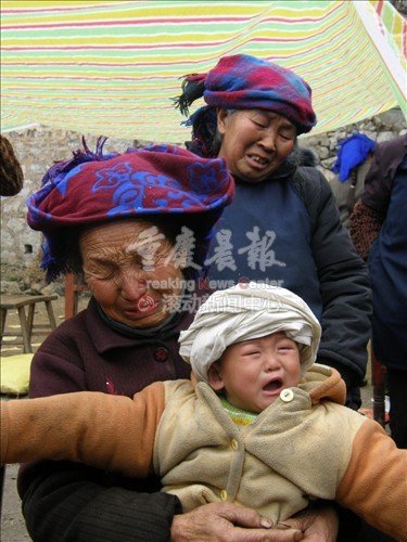 死者郭永志的母亲抱着郭的9个月儿子(前),与死者郭永华的母亲(后)痛苦不堪。记者 郎清湘 摄